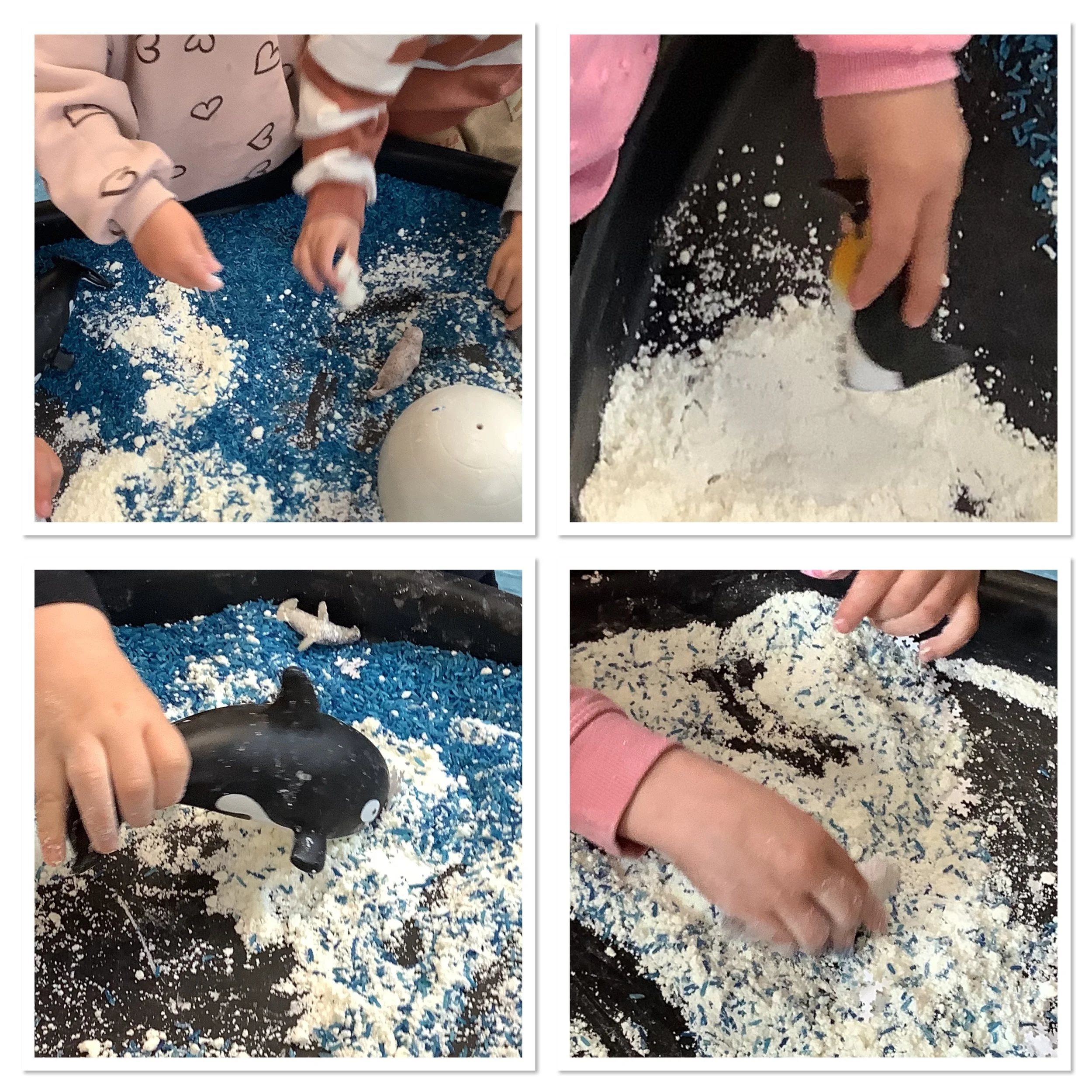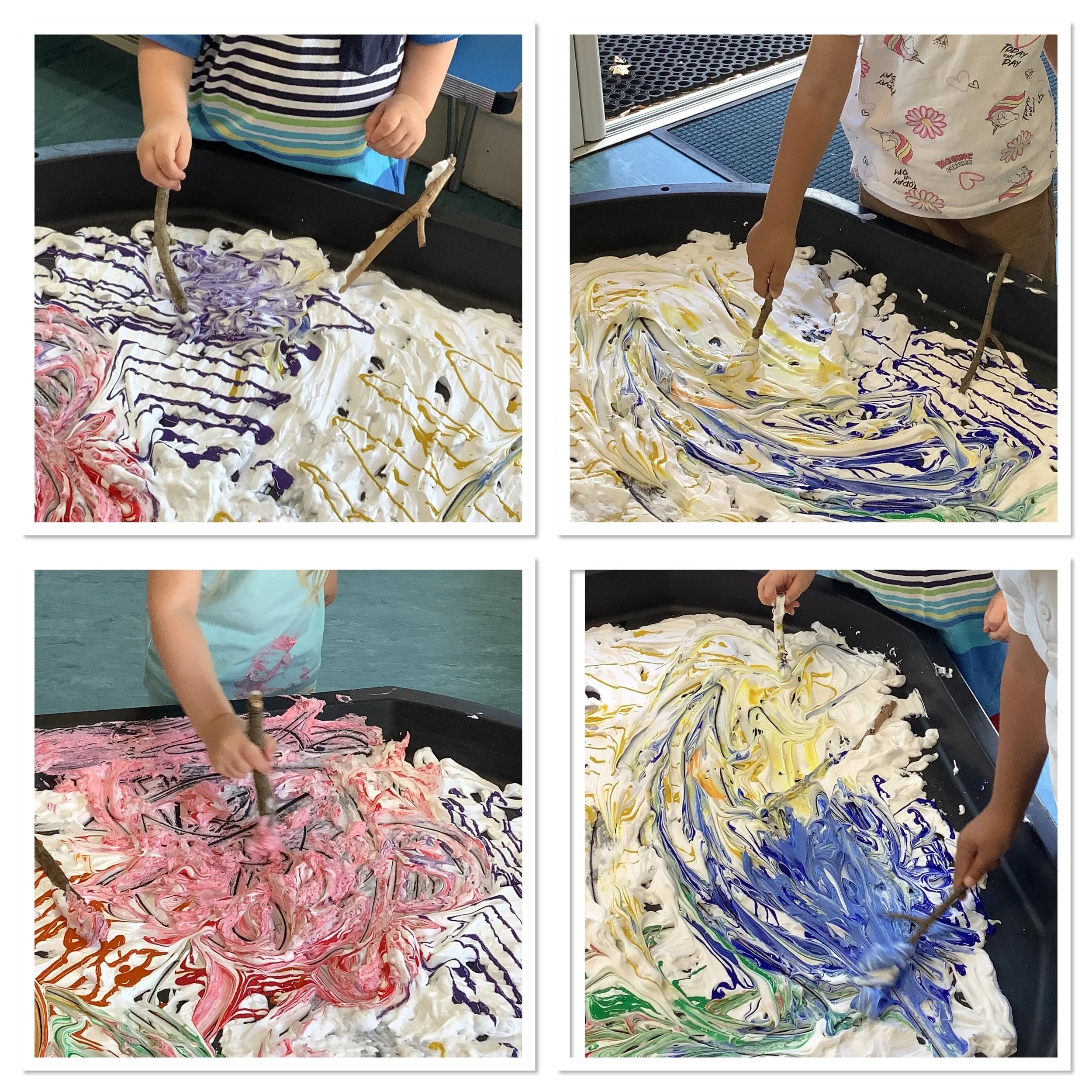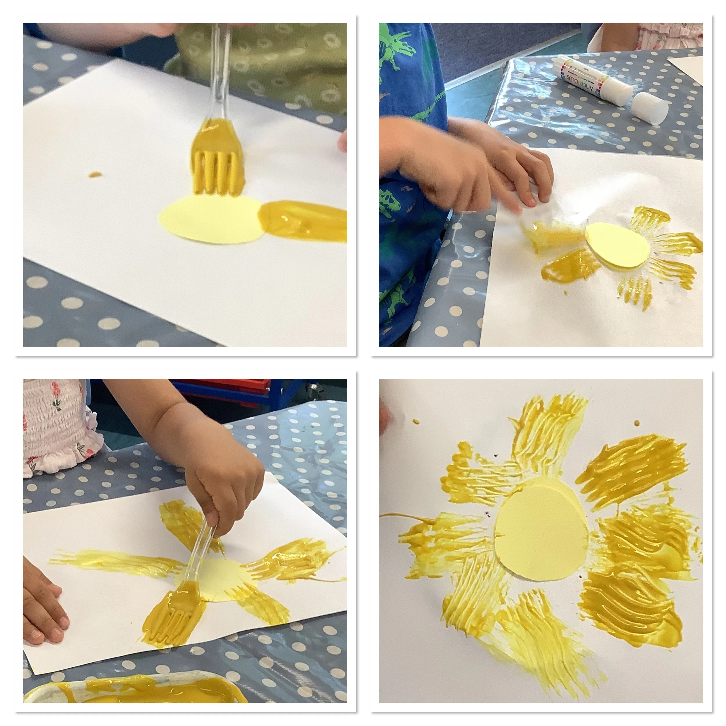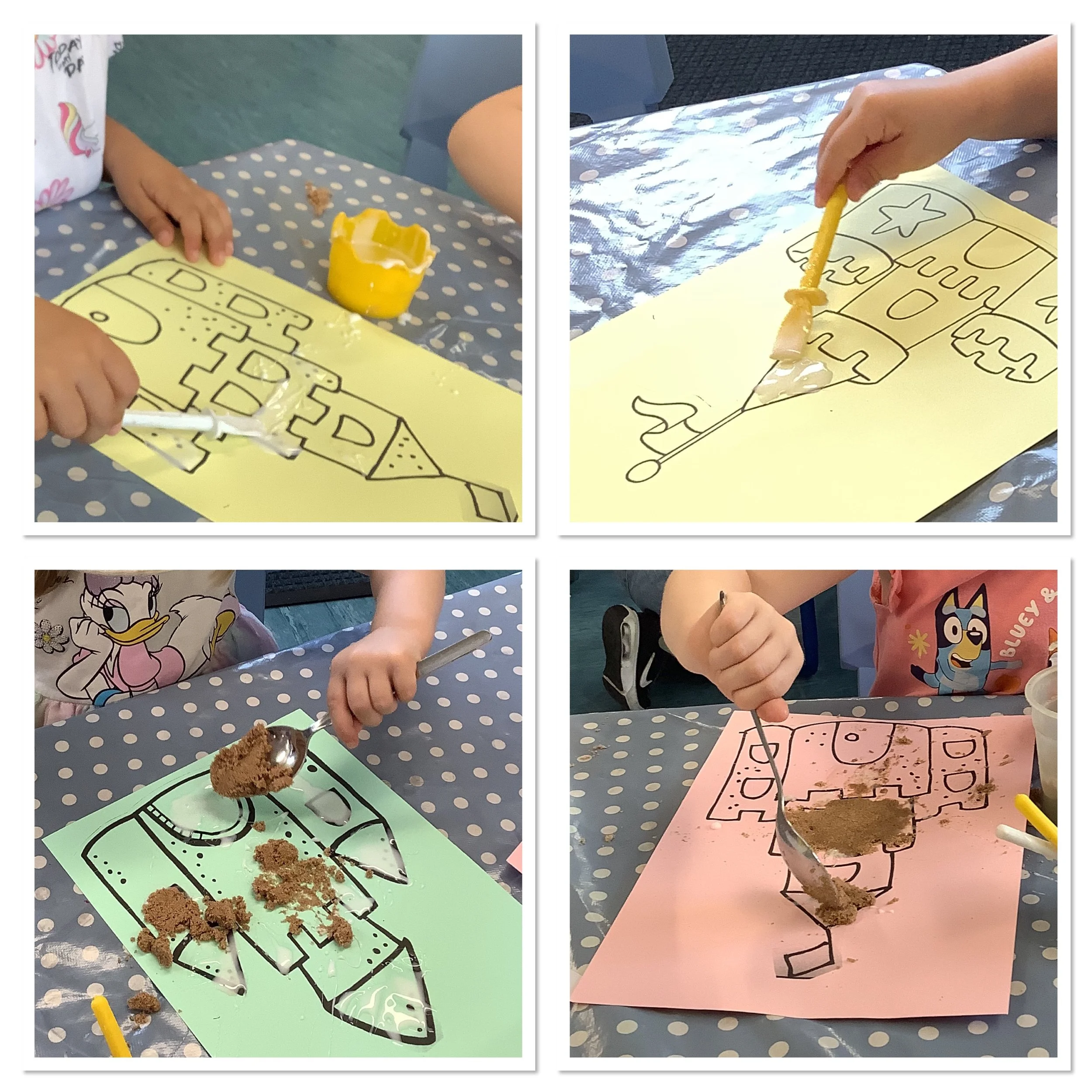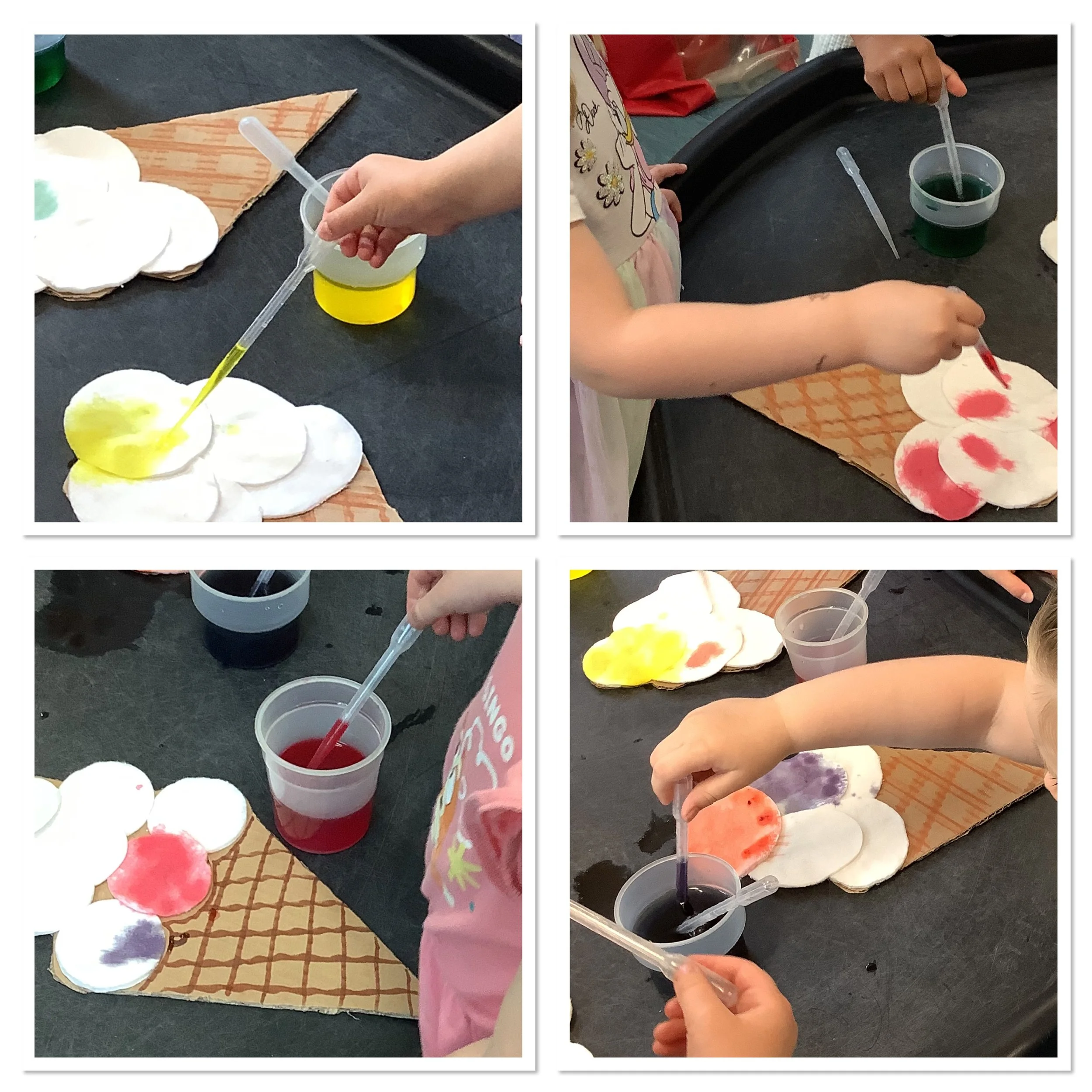 As the summer term progresses we have all been enjoying the lovely sunny days. Many of our children have also been going off on holiday or enjoying day trips to the beach and pools or home based garden days, so there’s been lots of chatter about sandcastles, water play and of course ice cream. So this week we decided to incorporate these things in our planning. We also wanted to decorate one of our display boards so had lots of fun creating an amazing paper chain octopus, colourful fish, decorative buckets and spades and some rather delicious looking ice lollies. We had beach themed activities specifically designed to help with our fine motor skills. Carefully using pipettes to decorate our ice creams and also creating summer potions. When we made our play dough together we added some sand to give it a different texture and then used beach shells and shell themed glass pebbles to make imprints. It’s so lovely to hear the children talking about their experiences with their families but also using rich descriptive language to talk about what they are making and exploring in playgroup. We hope you enjoy looking at and hearing about what we got up to during our summer exploration this week.