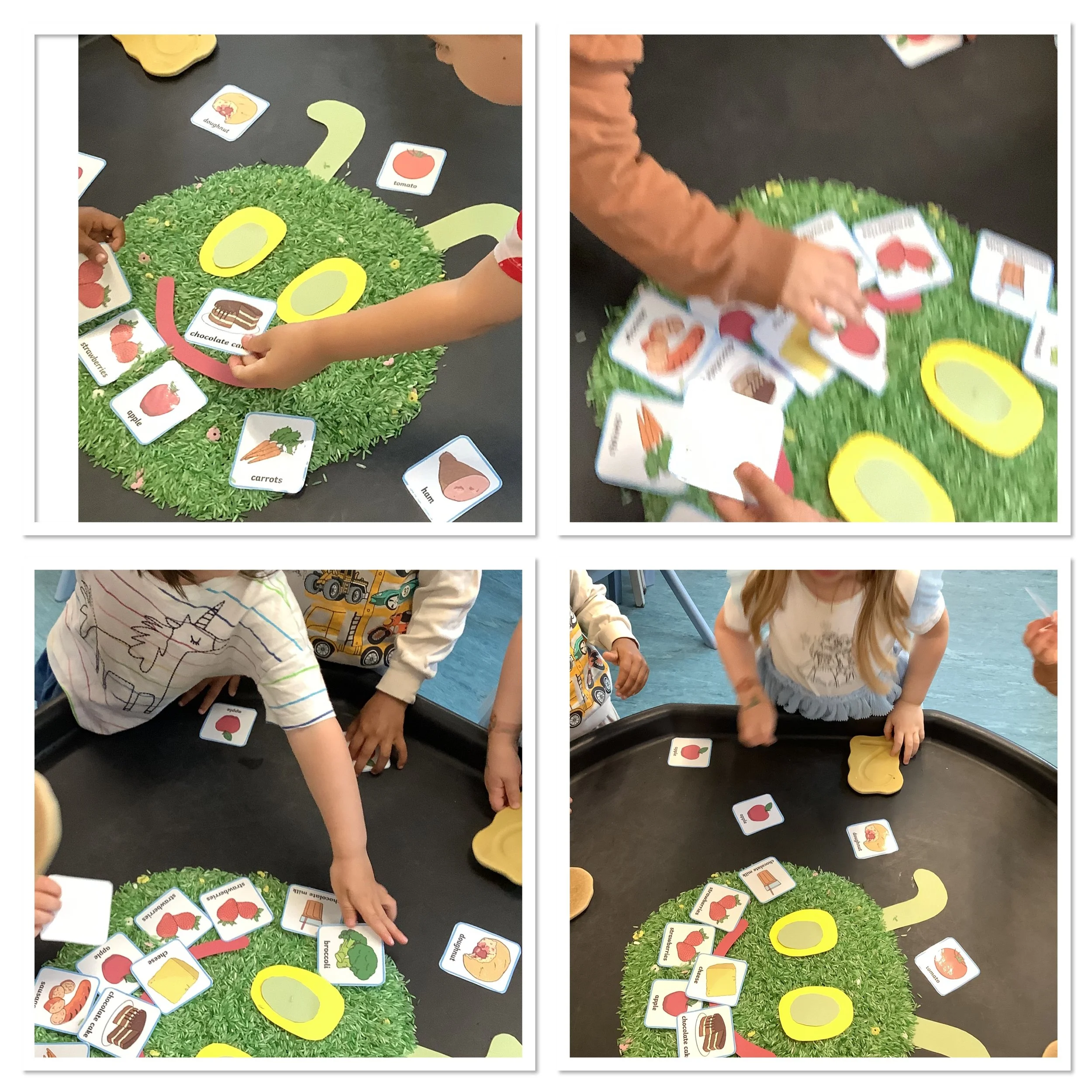 We incorporated two of our favourite stories in our planning firstly ‘Alan’s big scary teeth’ a book about a scary crocodile who has some rather surprising teeth and also ‘The Very Hungry Caterpillar which helped us to think about which foods we could each more of and which we should try to eat less of.