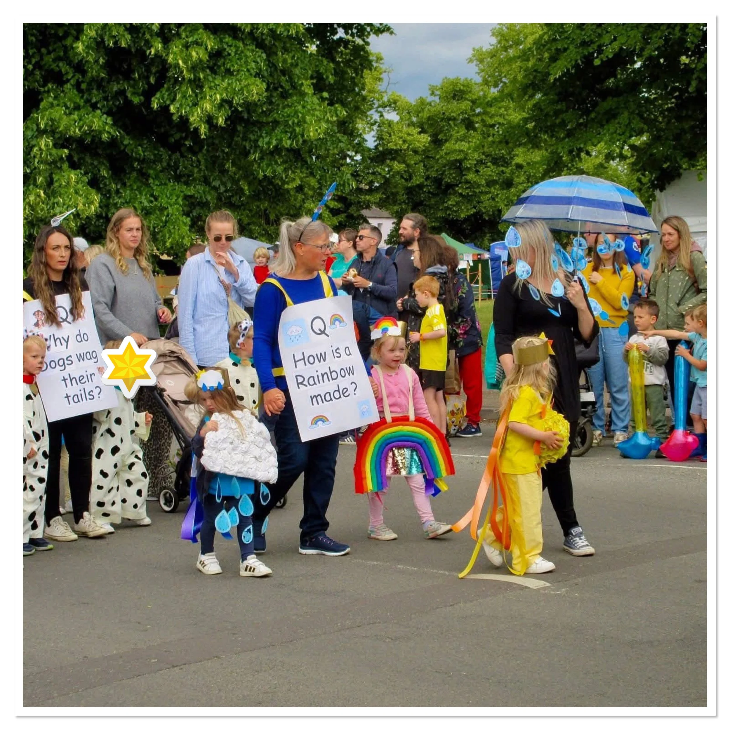 This week we have been preparing for the Village Feast, creating costumes, banners and decorations. We want our children to be proud of their village and surrounding areas and become active supportive members of the community and one way we can achieve this is to encourage the children and their families to join in events like the Feast. All costumes are made by staff and children which means that there are no barriers for families and all children can be part of this lovely community event. This year the theme was ‘Something beginning with Q’ so at playgroup we settled on ‘Questions of a pre-schooler’ Children love to ask questions especially why so we thought that this was perfect. All questions were posed by our children recently and included
