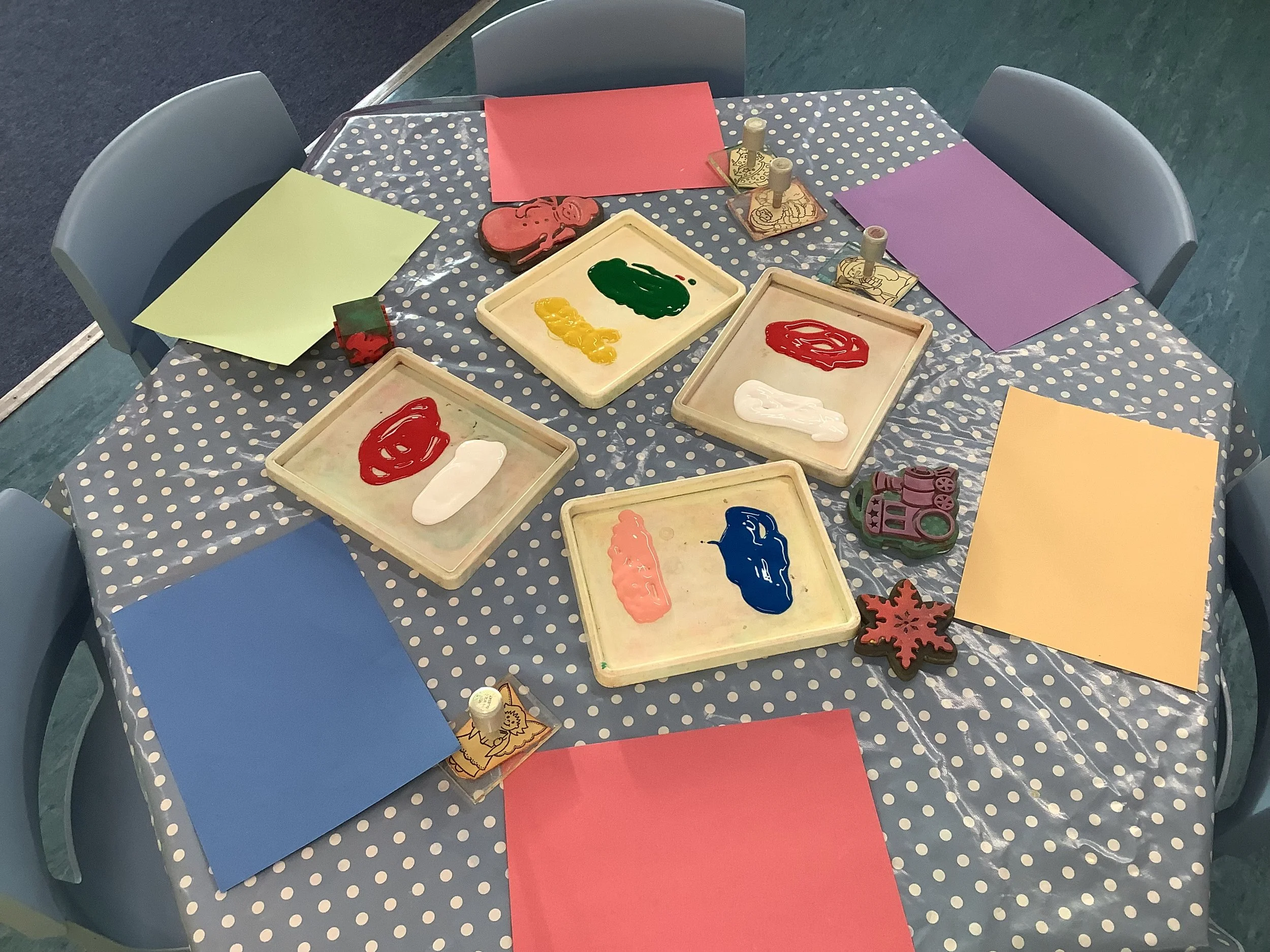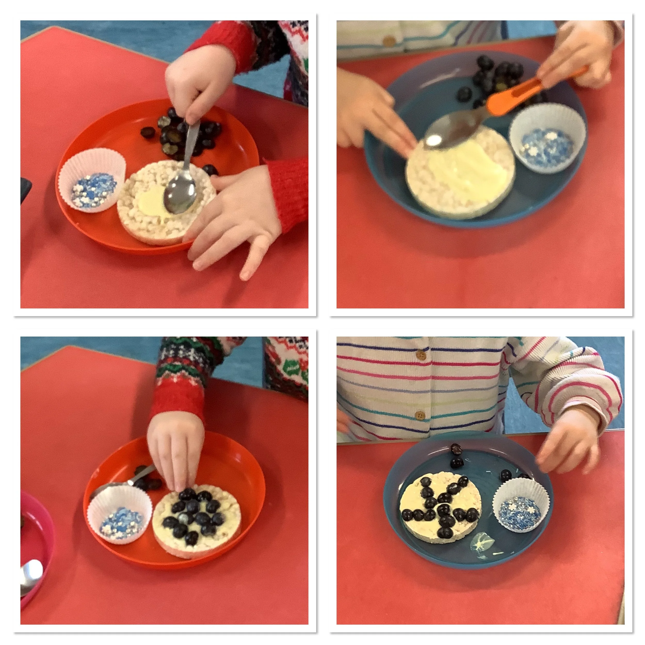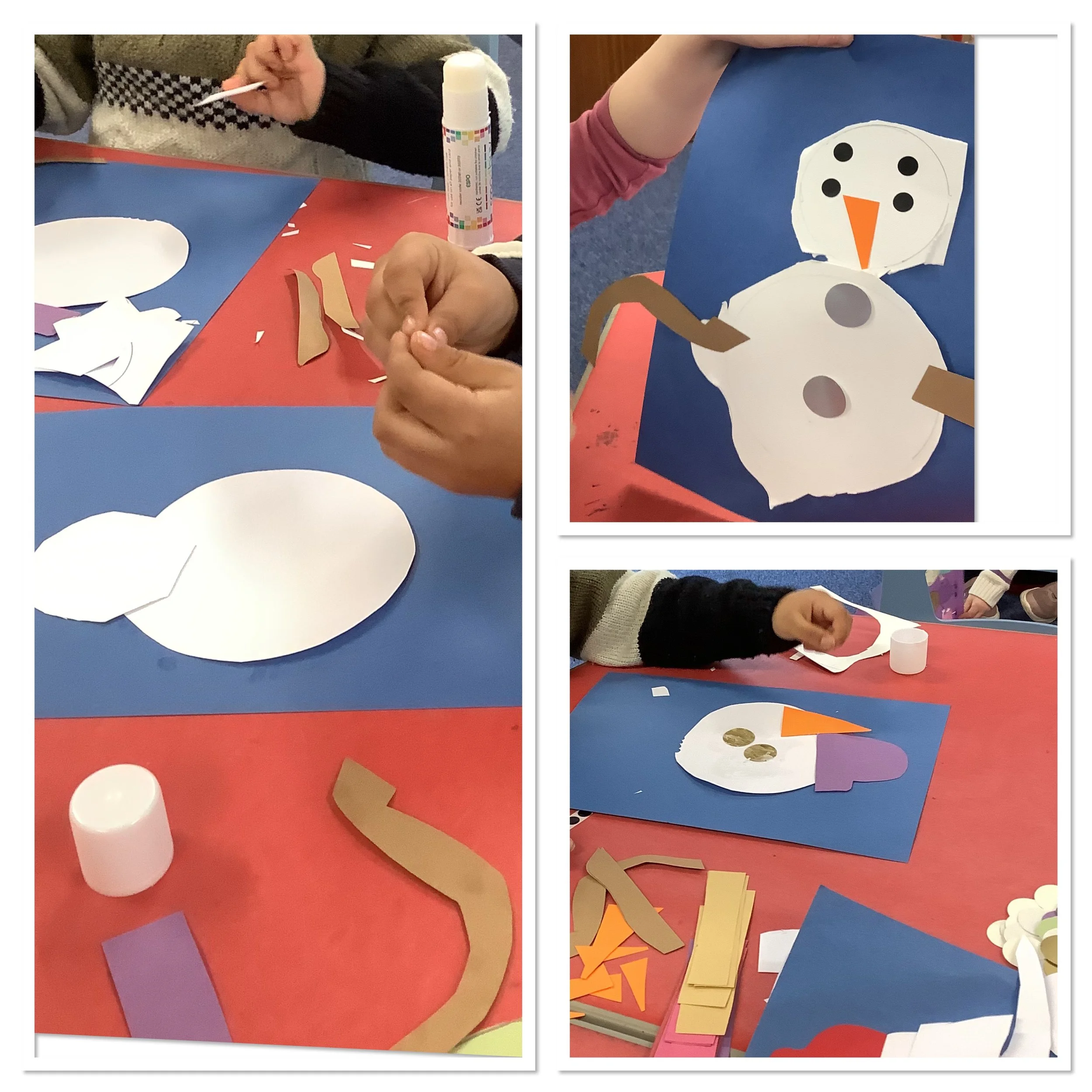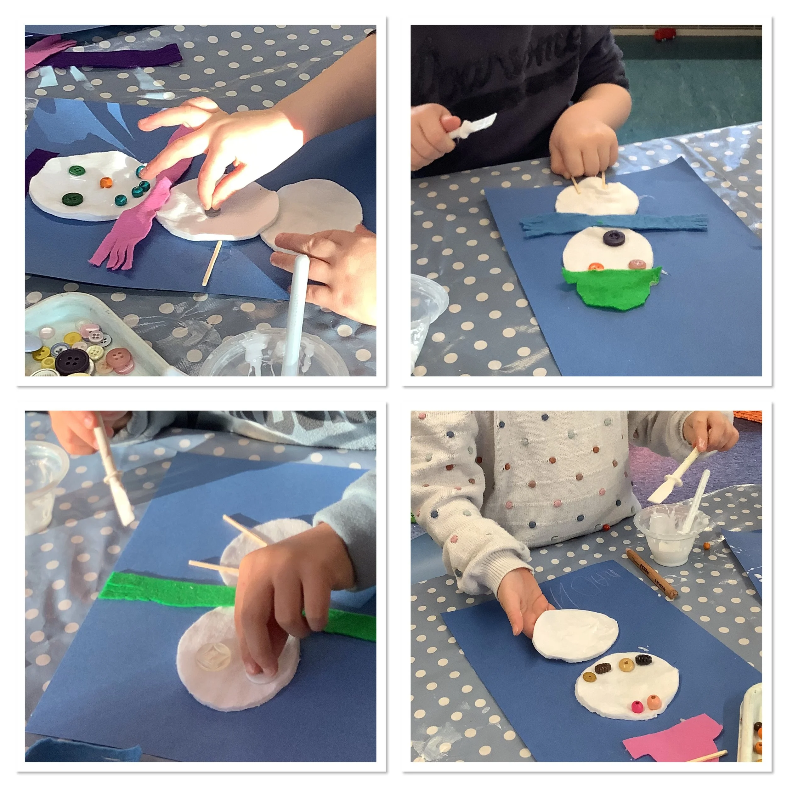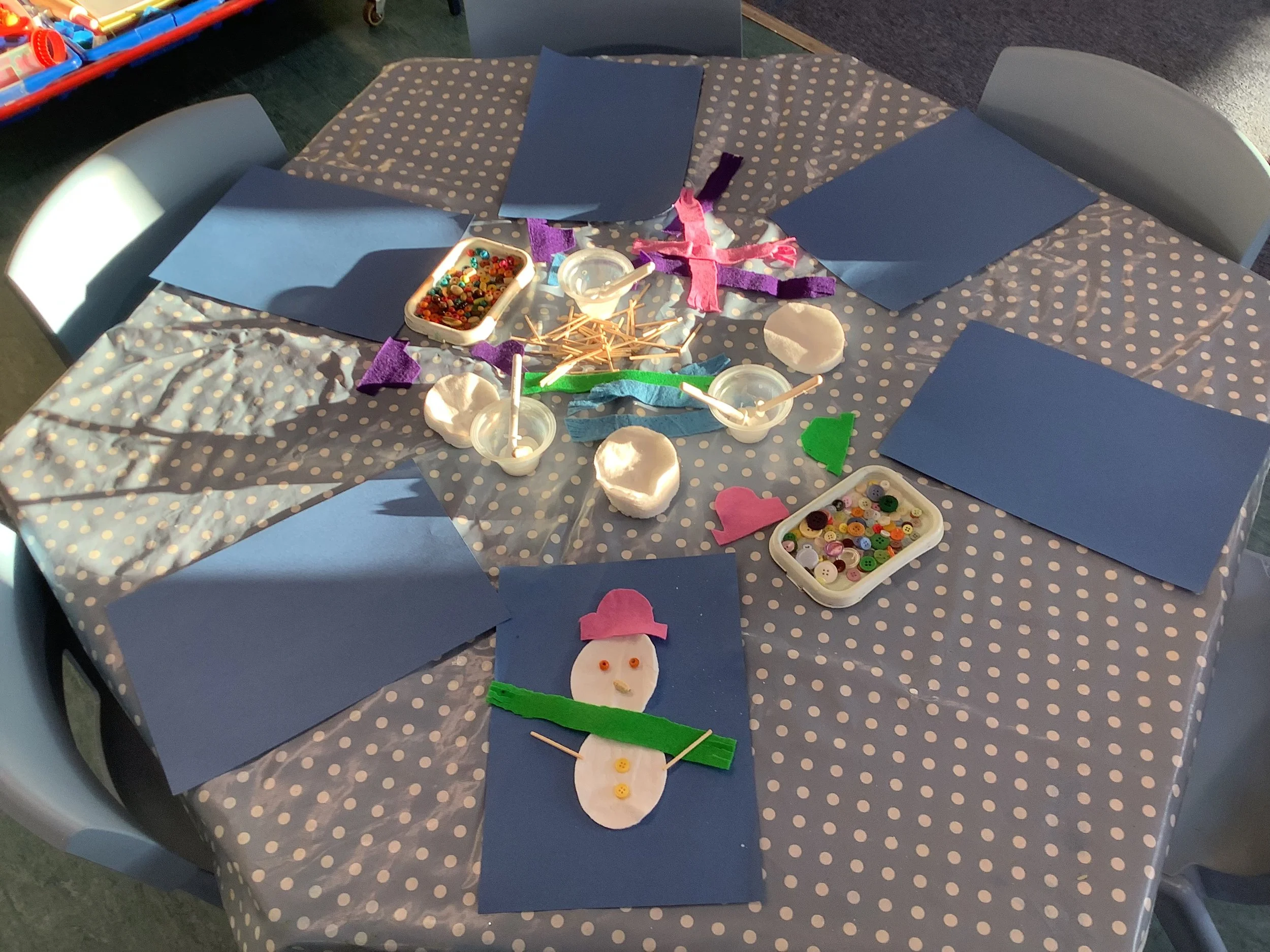 We’ve spent the last couple of weeks thinking about the beginning of winter and what the children associate this period with. When we talked to the children about winter and what it meant to them there was lots of talk about ice and snow, building snowmen and also polar animals and their habitat. Unfortunately there was no actual snow to explore so we made do with lots of sensory experiences and ice creating with some amazing structures and artwork. The children also made some snowmen garlic bread muffins and blueberry and white chocolate rice cake snowflakes. Snow and ice are very broad themes and we were able to incorporate lots of the children’s ideas and interests in each activity and they really enjoyed the winter construction site and the skating penguins who actually moved around as the ice melted. We also spent time creating our “Jolly Roll Christmas Tree” entry to the Landbeach Tree Festival, the children carefully painted what seemed like hundreds of toilet rolls and created beautiful decorations to decorate our lovely tree and this got us all in the Christmas spirit. We were also all very excited to begin opening our advent calendars. This year we had one with all the staff and children hiding behind the doors of our gingerbread house and also a cottage story one. The staff read a different story in session each day and have spent time recording the stories too so that even if it’s not a playgroup day the children can still hear and see the stories at home. Remember to come back next week and see all of our Christmas activities
