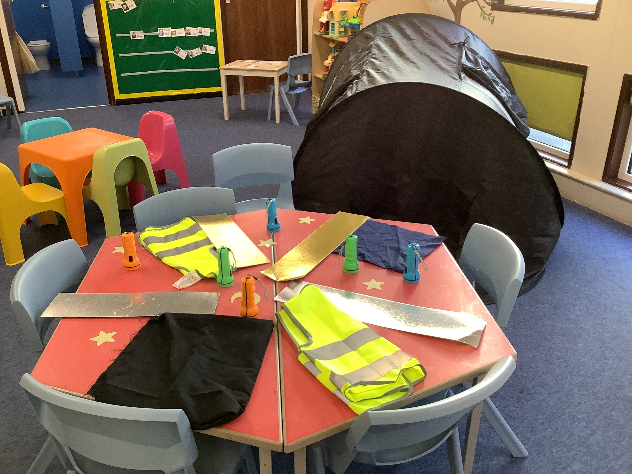 The children also enjoyed thinking about how to be safe and seen whilst out in the dark, exploring reflective clothing and torches and renewing their road safety knowledge.